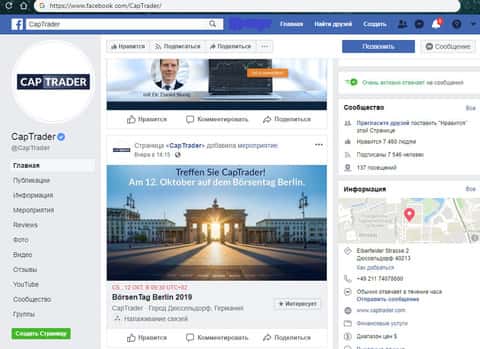Дабы соответствовать современным трендам шулера CAPTrader оперативно обзавелись страницами в различных социальных сетях, одной из которых стал Facebook, где мошенники КАП Трейд пожалели денег и не накрутили много подписчиков, а всего несколько тысяч, не проявляющих активности. На изображении, расположенном ниже, вы можете увидеть страницу аферистов CAPTrader в Фейсбук.