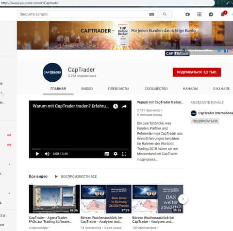 Для размещения различных рекламных видеороликов аферисты КАП Трейд обзавелись страницей в социальной сети Ютубе, где аферисты CAPTrader имеют всего-то несколько сотен подписчиков и не имеют никакой активности пользователей на канале. На изображении, расположенном ниже вы можете наглядно увидеть страницу жуликов КАП Трейд в Ютубе.