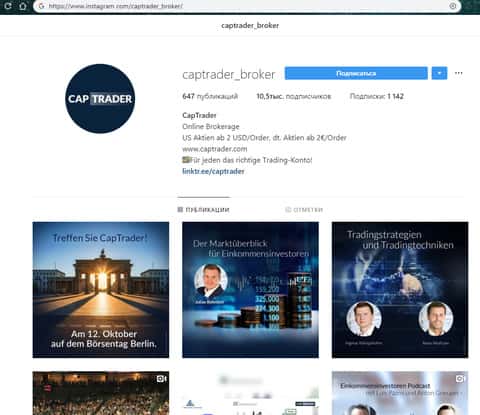 Обзавелись жулики КАП Трейд и страницей в нынче популярной социальной сети Инстаграм, где лохотрон CAPTrader накрутил около десяти тысяч подписчиков, однако активности пользователей на его аккаунте не наблюдается. На изображении, расположенном ниже, вы можете наглядно увидеть страницу аферистов КАП Трейд в социальной сети Instagram.