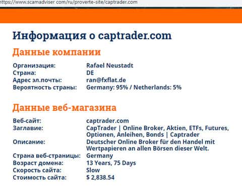 В связи с мошеннической и противозаконной деятельностью лохотрона КАП Трейд его реальные руководители предпочитают анонимность дабы избежать ответственности со стороны правоохранительных органов. Информацию о самом же сайте аферистов CAPTrader вы можете узнать с помощью портала scamadviser com, которую вы можете наглядно увидеть на изображении ниже.