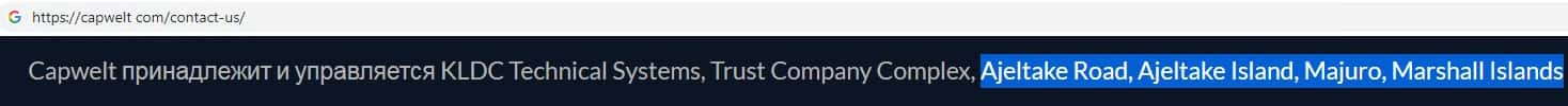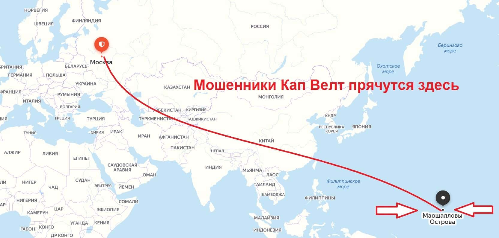 Местом регистрации скам-брокера Кап Велт является один из оффшоров, а именно Маршалловы острова, где зарегистрировано огромное количество аналогичных лохотронов.