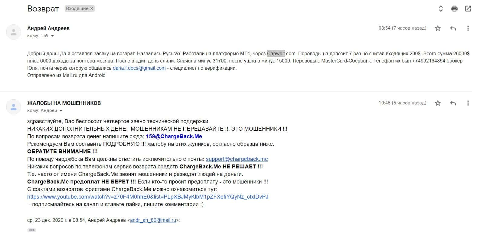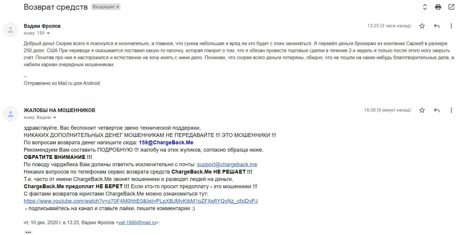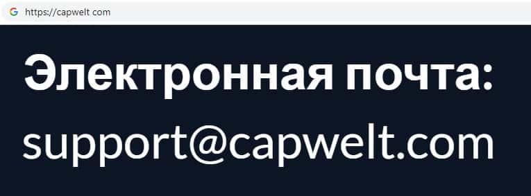 Обманщики CapWelt на своем официальном интернет-ресурсе указывают адрес электронной почты, а именно: