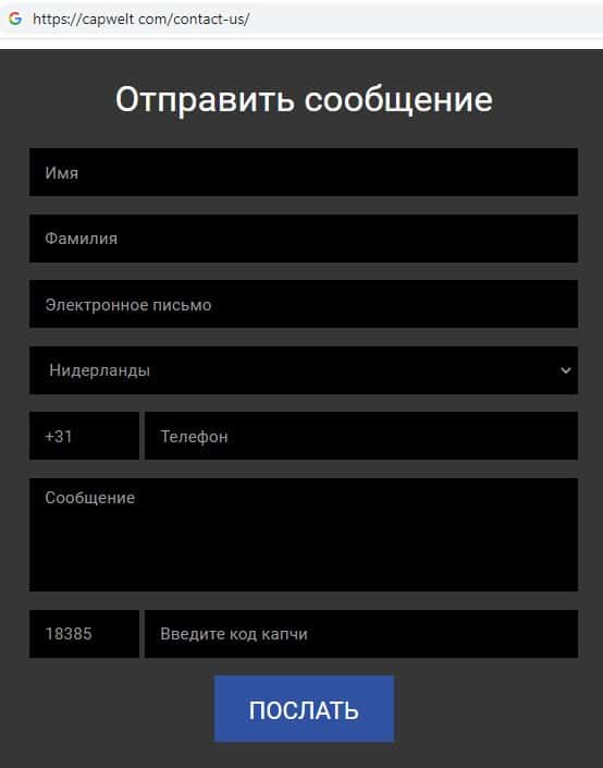 Жулики CapWelt предлагают пользователям заполнить бланк обратной связи, где просят указать свое имя, фамилию, адрес электронной почты, страну проживания и номер телефона.