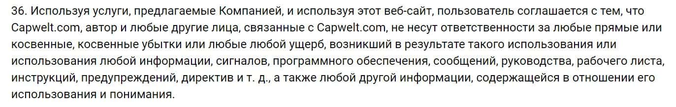 Согласно тому, что аферисты пишут в соглашении, скам-компания Кап Велт не несет никакой ответственности за не полученную прибыль клиентом, а так же за вероятные убытки.