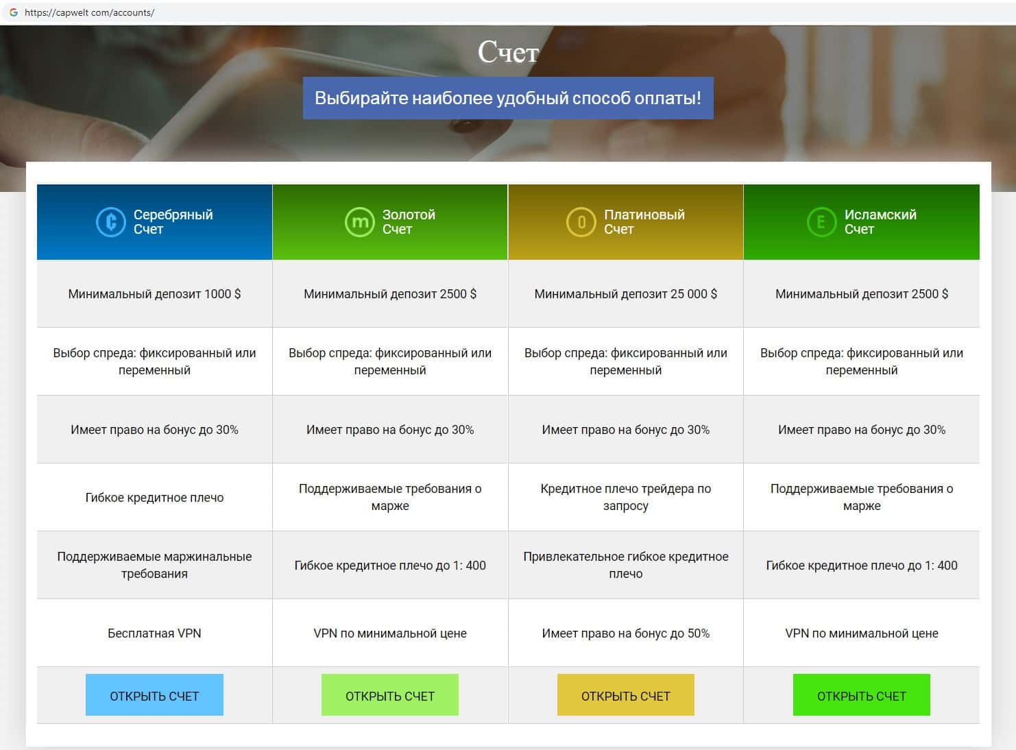 Лохотронщики Cap Welt предлагают клиентам на выбор 4 типа торгового счета: Серебряный, Золотой, Платиновый и Исламский счет. Реальный форекс стартует в основном с суммы в 100000 $.