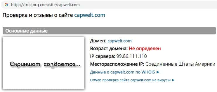 Проверка онлайн-ресурса шулеров CapWelt на trustorg com показала, что возраст домена определить невозможно, мы имеем дело с очередной мошеннической организацией.