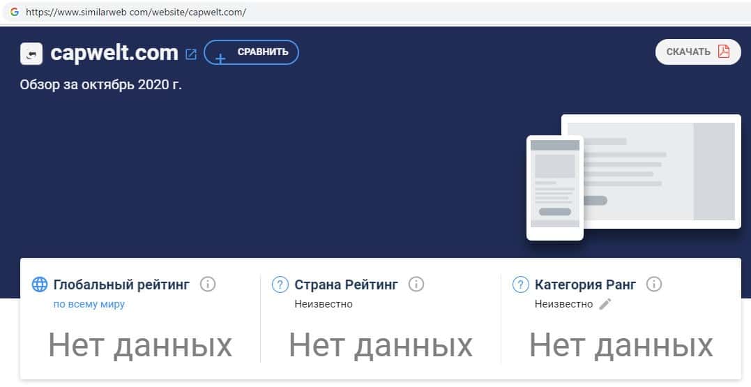 При проверке источников бренда по странам компании Кап Велт на сайте similarweb com, данные отсутствуют, что является признаком фейкового лохотрона.