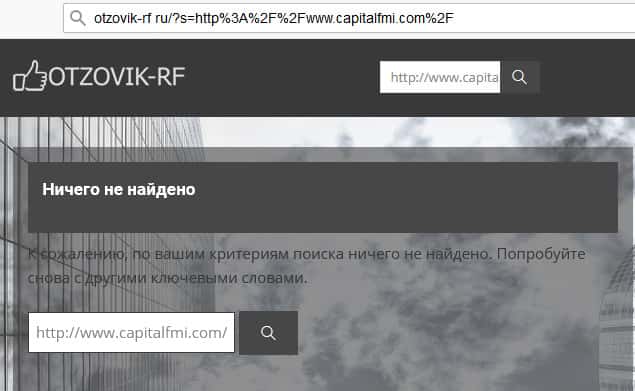 Видимо при жизни CapitalFMI очень хорошо чистили негативную информацию о себе, потому что найти о них что-то практически нереально. Даже если хорошо прошерстить самые известные порталы отзовиков в рунете. Например, на сайте otzovik-rf ru нет отзывов об этих жуликах.