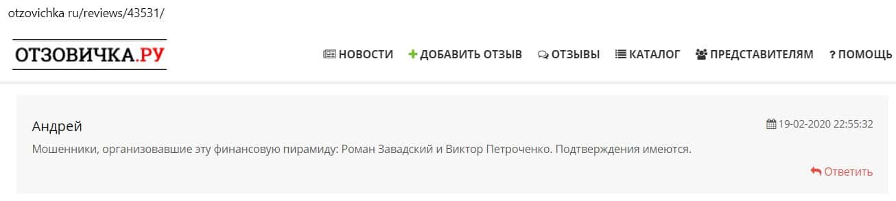 Андрей написал, что он знает, кто организовал пирамиду под названием CapСom In. Это мошенники Роман Завадский и Виктор Петроченко, доказательства этого у него есть.