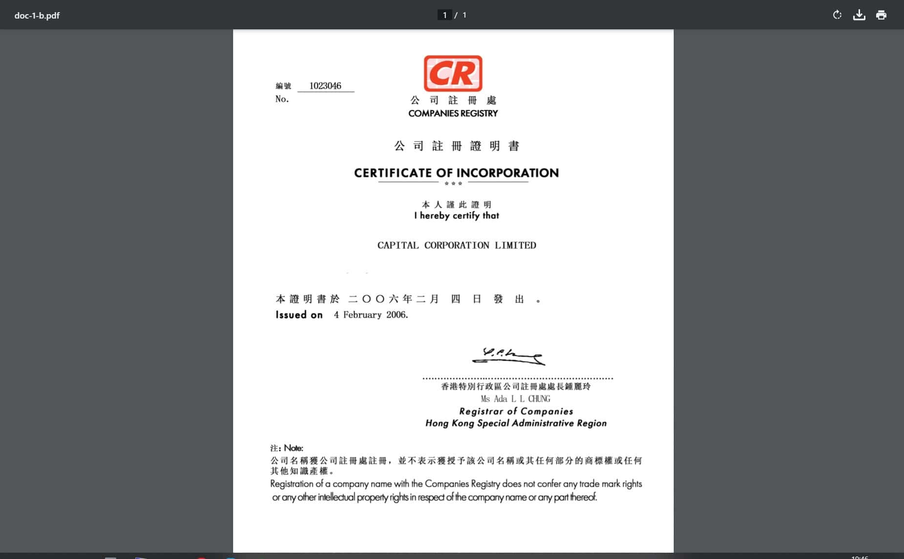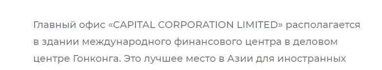 Юридическим лицом, действующим от имени компании Капитал Корпорейшион, является организация Capital Corporation Ltd, зарегистрированная в Гонконге.