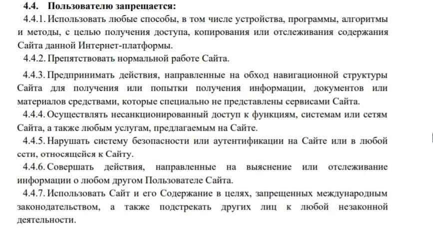 В пункте 4.4 клиент может прочитать о том, что ему запрещено: препятствовать нормальной работе сайта CapСom In, нарушать условия договора и т.д.