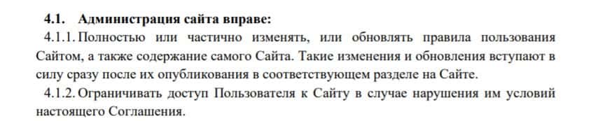 Пункт 4.1 говорит о том, что администрация сайта CapСom In может полностью или частично изменять условия данного соглашения в любое время.