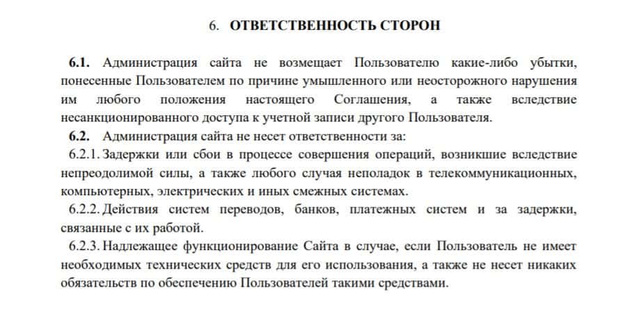 Раздел 6 уведомляет пользователя, что компания CapСom In не возмещает убытки клиента, полученные на сайте, а также не несет ответственности за технические сбои.