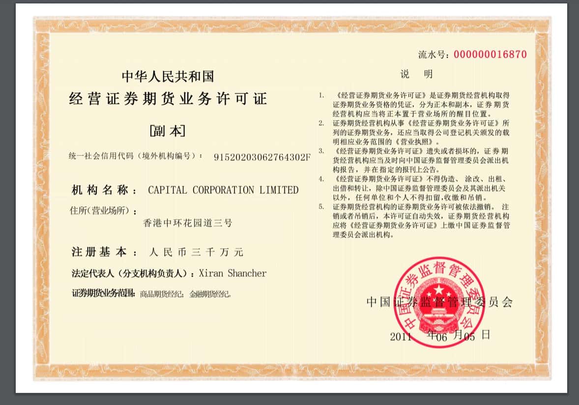 Лицензии на брокерские услуги контора Капитал Корпорейшион не имеет. Зато она выложила на свой сайт сертификат на китайском языке об инвестиционной деятельности.