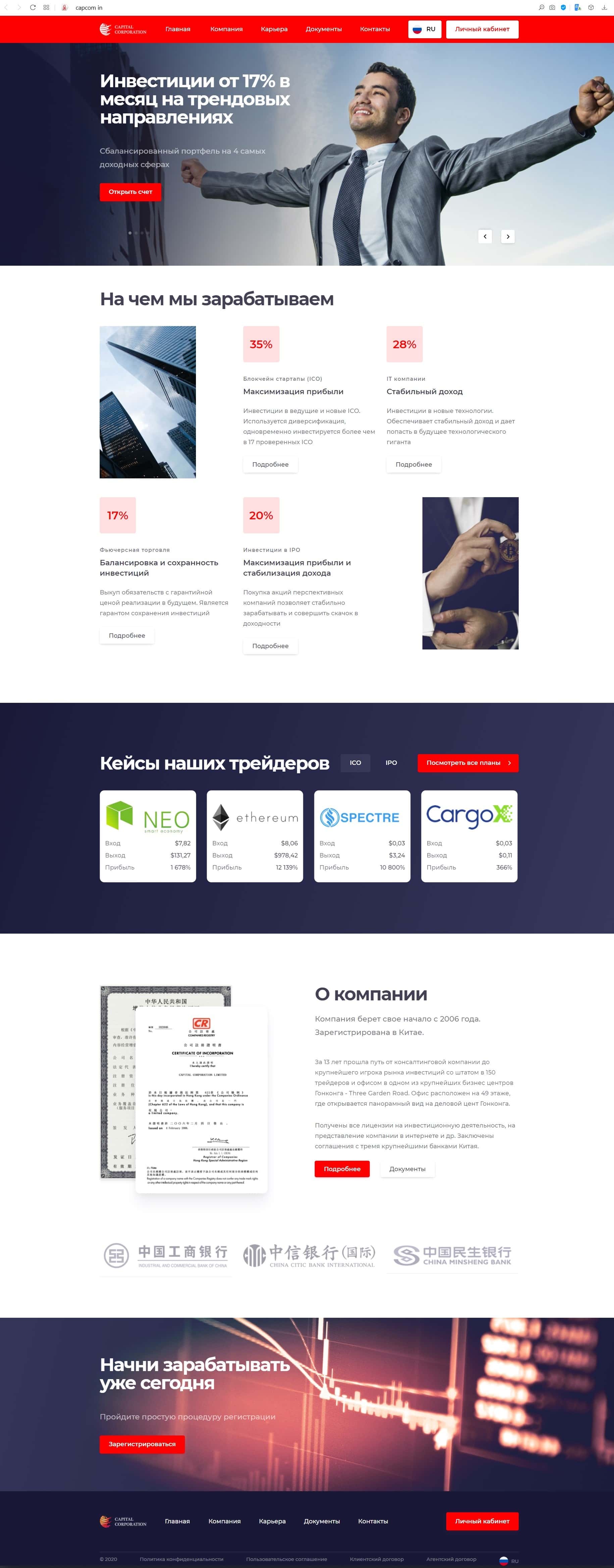 Капитал Корпорейшион - это очередной лохотрон, маскирующийся под солидную международную компанию. Мошенники постарались сделать интересный сайт, чтобы запудрить людям мозги, даже выложили на нем множество лицензий, которыми они якобы обладают. Но все это только слова, так как никаких подтверждений их успешной финансовой деятельности нет. Также, как нет и разрешения на брокерскую деятельность, которую компанию ведет, наряду с консалтинговыми и инвестиционными услугами, Так что все эти липовые бумажки - пустой звук. Исследования домена доказывают, что контора образована недавно и имеет слабую посещаемость, что характерно для вновь созданных ресурсов. Делаем логичный вывод, что перед нами очередная скам контора, имеющая единственной целью грабеж своих клиентов. Ни в коем случае не вступайте в Capcom In, вы можете крупно пожалеть об этом решении!