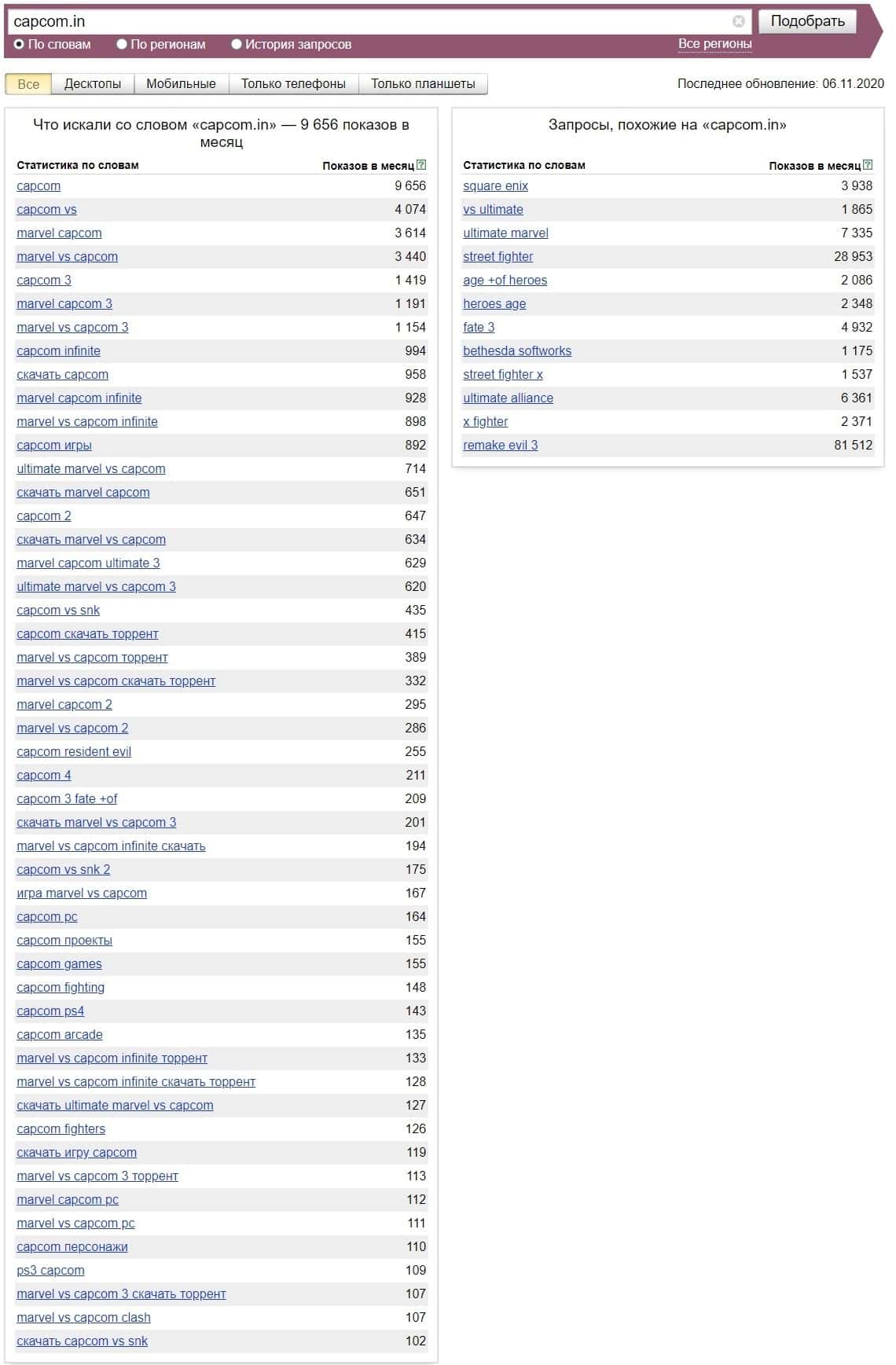 В поисковой системе Яндекс доменное имя сайта "capcom.in", вбитый в строку с точкой, пользователи вбивали 9656 раз за месяц, но запросы относятся к другой организации.