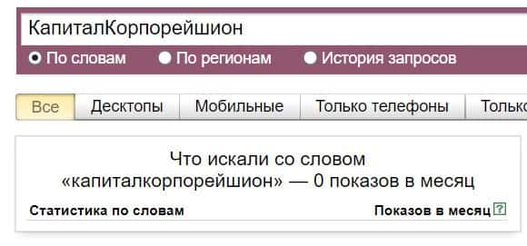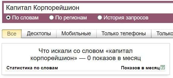Посмотрим, сколько раз люди искали название бренда "Капитал Корпорейшион" на русском языке с пробелом: 0 раз за месяц.