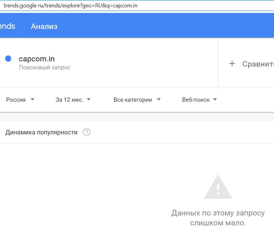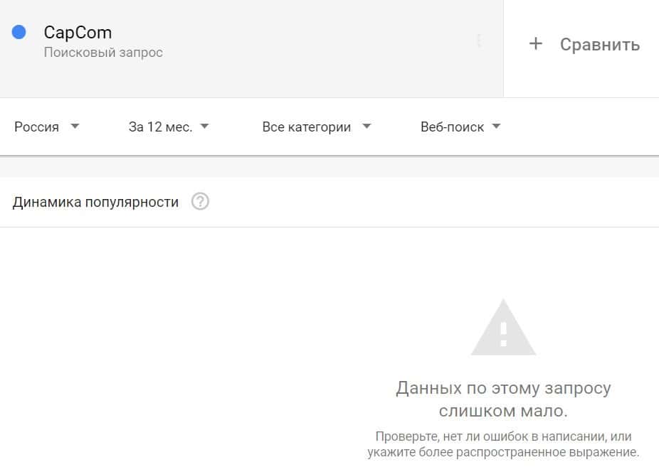 Посмотрим, насколько популярно название бренда "CapСom", написанное на английском языке. Данных по этому запросу нет, так как никто не искал этот бренд в Гугл.