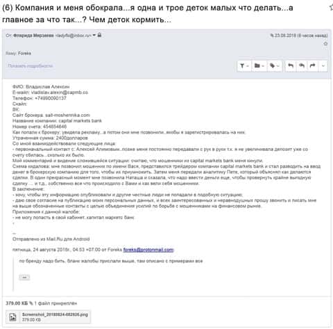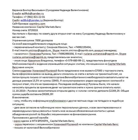 Жалоба от очередного обворованного клиента конторы Capital Markets Banc