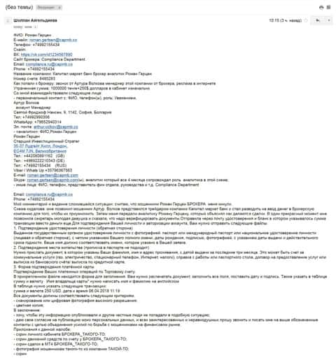 - Артур Волков - тел. +74992990356, +79652940314, почта arthur.volkov@capmp co, адрес: Святой Фриджоф Нансен, 9, 1142, София, Болгария - звонарь, который уломал клиента открыть счет и вложить все свои деньги;