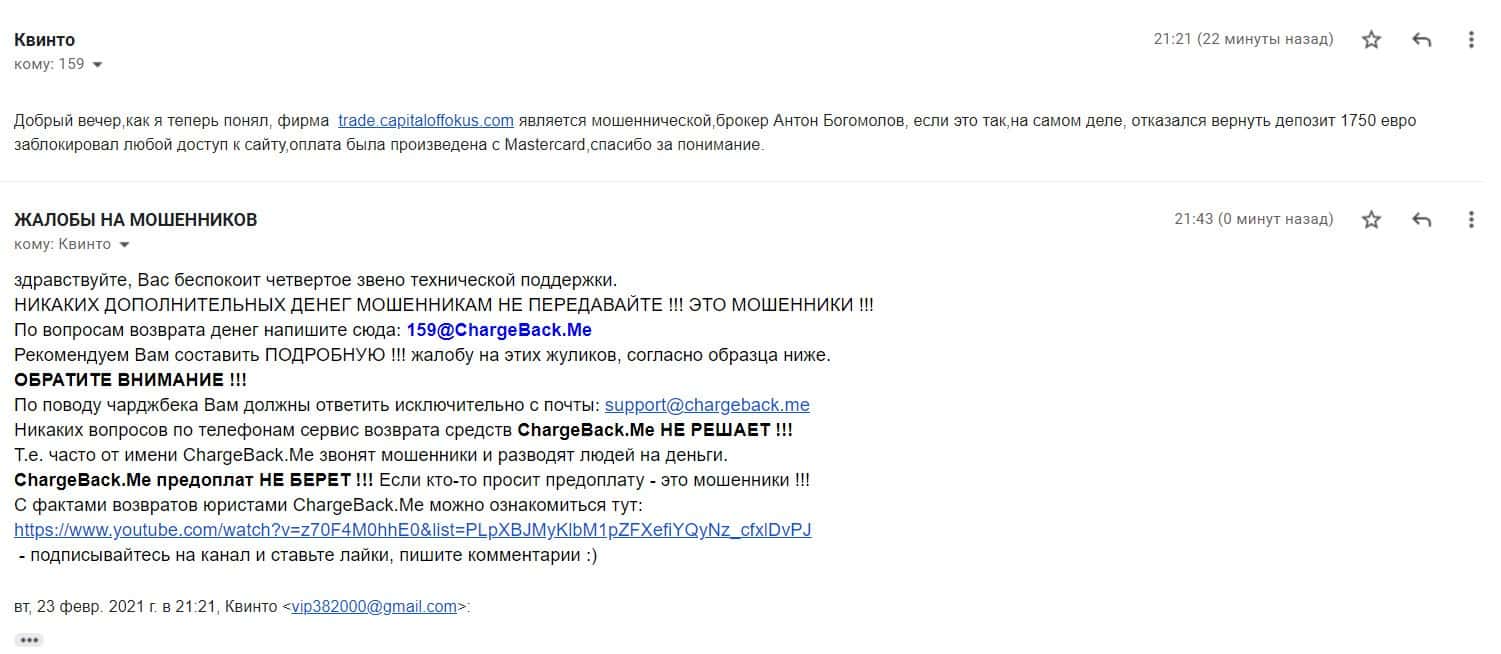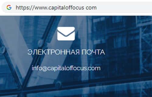 Жулики CapitalOfFocus на своем официальном интернет-ресурсе указывают адрес электронной почты, а именно: