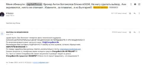 В данном разделе предлагаем увидеть информационный материал в виде жалобы на мошенническую контору Капитал Оф Фокус, которая развела клиента на 6000 евро.