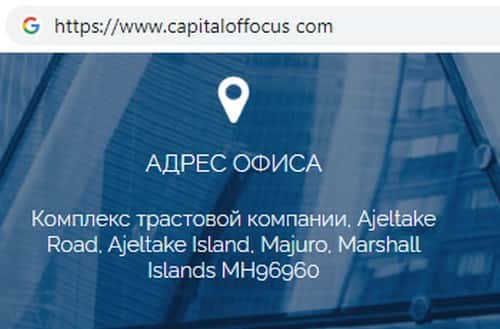 CapitalOfFocus - еще одна жульническая организация, которая оказывает псевдо-брокерские услуги, аферисты скрывают информацию о юридических лицах компании, а также о руководстве, у данной скам-конторы отсутствует лицензия на предоставление брокерской деятельности, поводом для написания данной статьи послужила жалоба от пострадавшего клиента об утрате денежных средств, стоит отметить, что мошенническая организация Капитал Оф Фокус как и большинство аналогичных компаний зарегистрирована в оффшоре, а именно на Маршалловых островах. Не рекомендуем связываться с обманщиками Capital OfFocus !!!