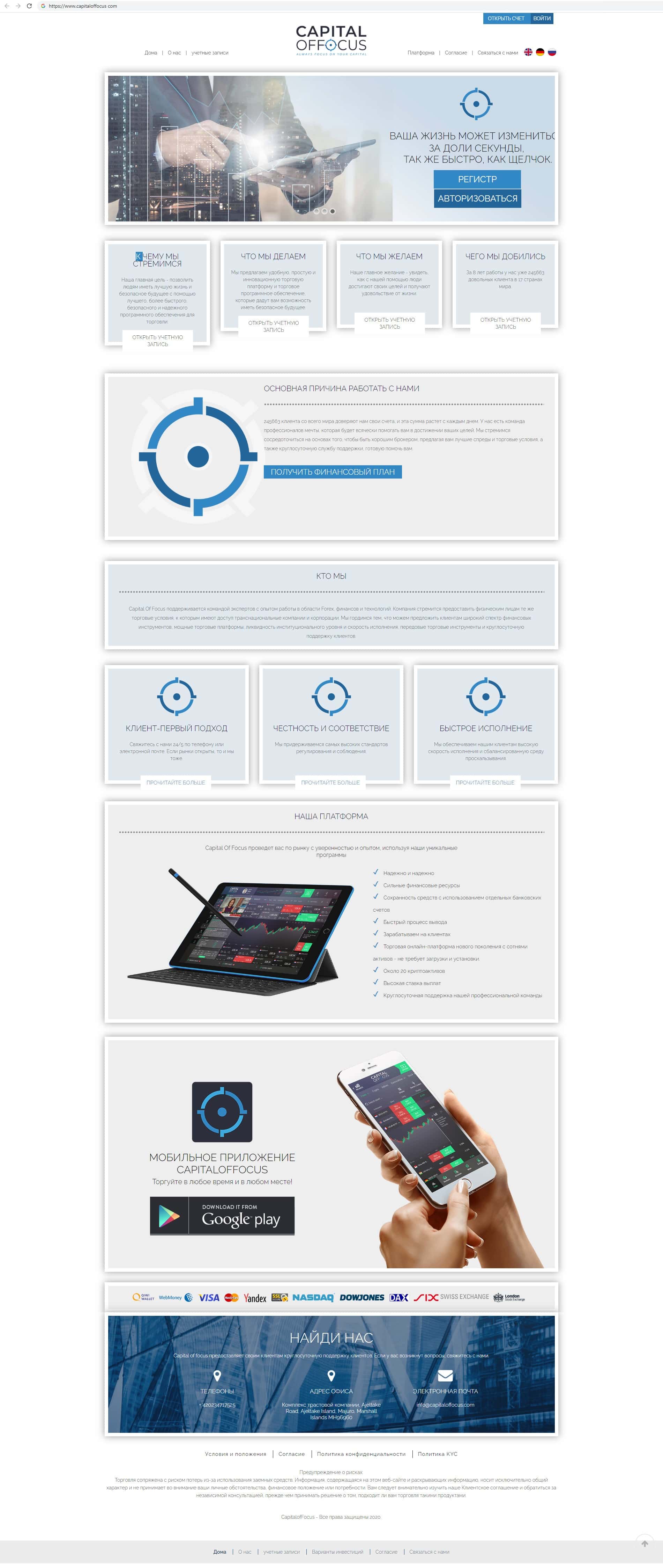 В данном разделе предлагаем увидеть скрин главной веб-страницы онлайн-ресурса скам-брокера Капитал Оф Фокус, помните о том, что такие проекты очень быстро скамятся.