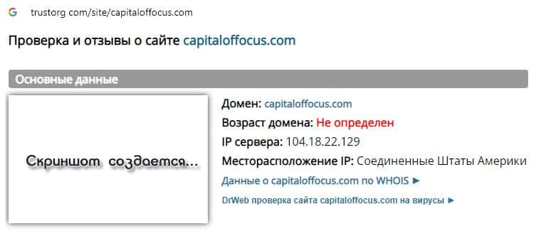 Проверка веб-портала лохотронщиков Капитал Оф Фокус на trustorg com показала, что возраст домена определить невозможно, мы имеем дело с очередной скам-организацией.