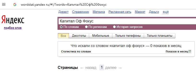 Количество брендовых запросов названия компании на русском языке "Капитал Оф Фокус" на Яндекс Вордстарт вероятно равно нулю.