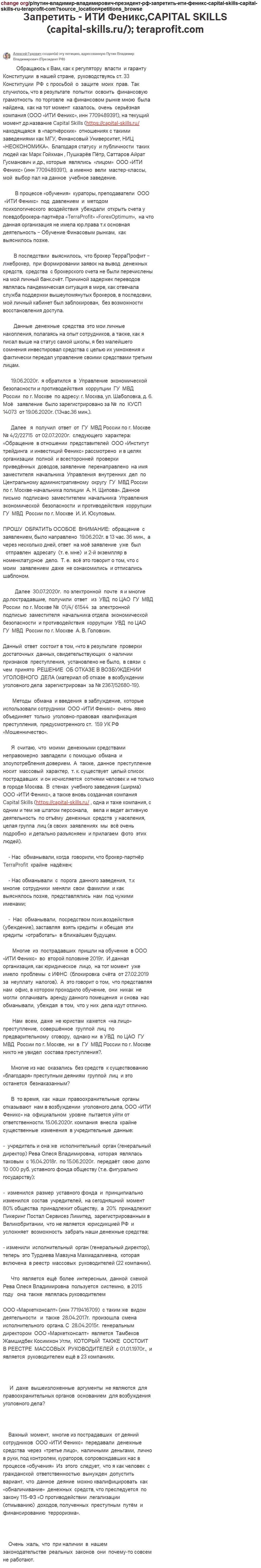 Ниже представлен скриншот петиции на имя президента РФ от обманутого пользователя. В ней приведено множество фактов и подтверждений мошеннических действий Капитал Скиллс!