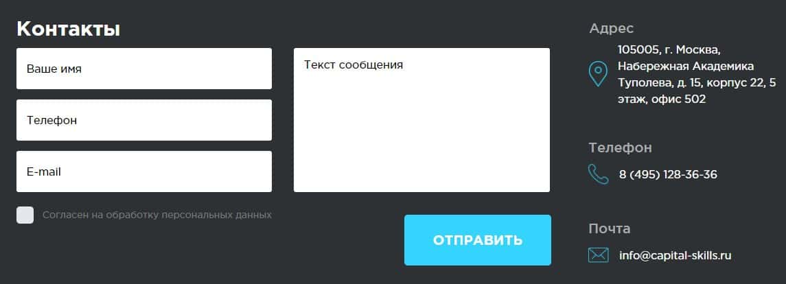 В разделе контактной информации, аферисты Капитал Скиллс указали адрес своего офиса и следующие способы связи: