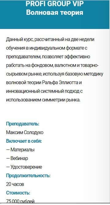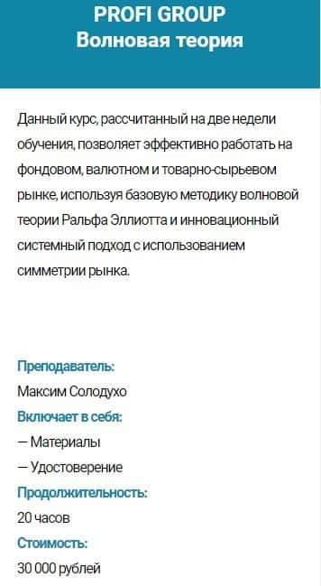 Курс PROFI GROUP VIP Волновая теория - стоимость 75 000 руб. Сюда входит: материалы, вебинар и удостоверение. Продолжительность обучения - 30 часов.