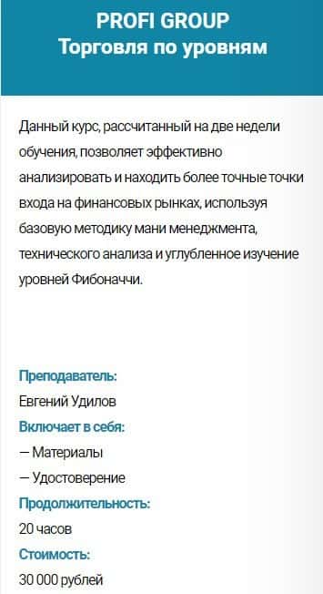 Курс PROFI GROUP Торговля по уровням - стоимость 30 000 руб. Сюда входит: материалы и удостоверение. Продолжительность обучения - 20 часов.