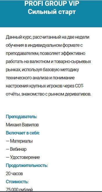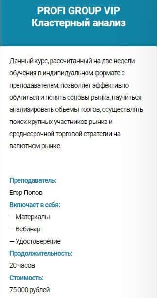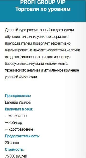 Курс PROFI GROUP VIP Торговля по уровням - стоимость 75 000 руб. Сюда входит: материалы, вебинар и удостоверение. Продолжительность обучения - 20 часов.
