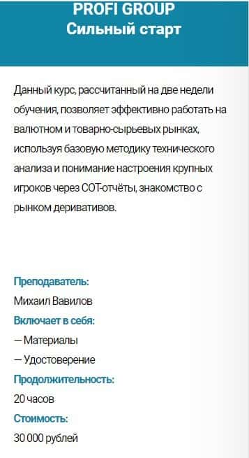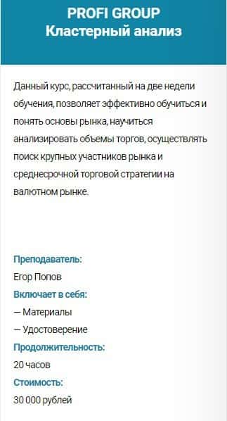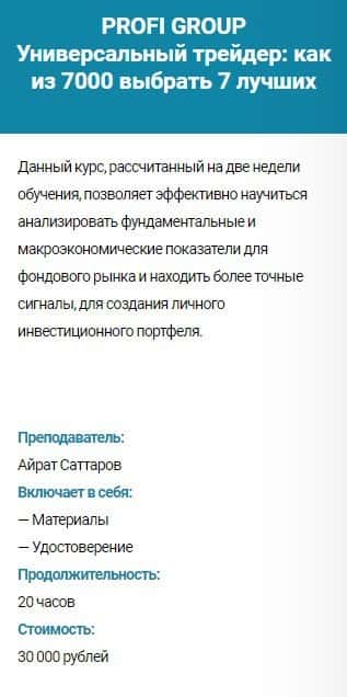 Курс PROFI GROUP Универсальный трейдер: как из 7000 выбрать 7 лучших - стоимость 30 000 руб. Сюда входит: материалы и удостоверение. Продолжительность обучения - 20 часов.