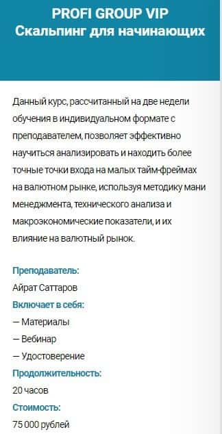 Курс PROFI GROUP VIP Скальпинг для начинающих - стоимость 75 000 руб. Сюда входит: материалы, вебинар и удостоверение. Продолжительность обучения - 20 часов.