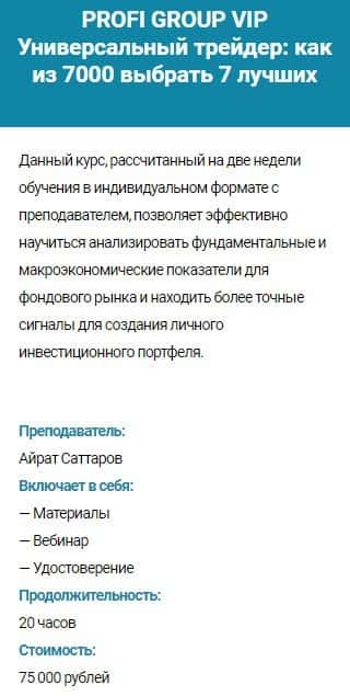 Курс PROFI GROUP VIP Универсальный трейдер: как из 7000 выбрать 7 лучших - стоимость 75000 руб. Сюда входит: материалы, вебинар и удостоверение. Продолжительность - 20 часов.