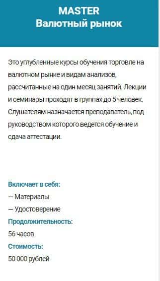 Курс обучения MASTER Валютный рынок - стоимость 50 000 руб. Сюда входит: материалы и удостоверение. Продолжительность обучения - 56 часов.