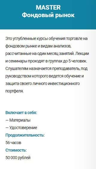 Курс обучения MASTER Фондовый рынок - стоимость 50 000 руб. Сюда входит: материалы и удостоверение. Продолжительность обучения - 56 часов.