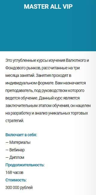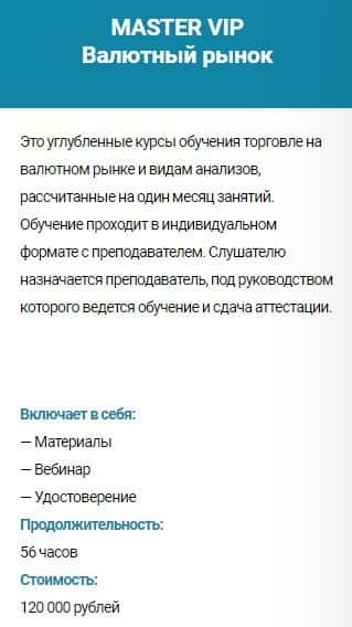 Курс обучения MASTER VIP Валютный рынок - стоимость 120 000 руб. Сюда входит: материалы, вебинар и удостоверение. Продолжительность обучения - 56 часов.