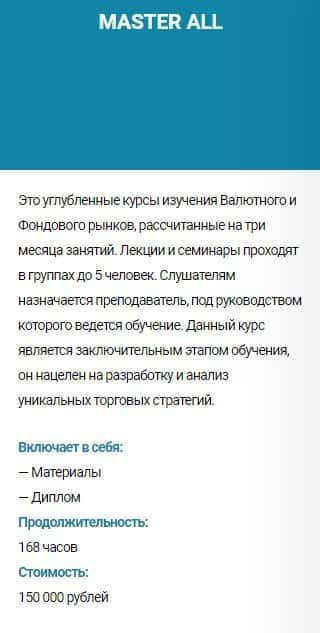 Курс обучения MASTER ALL - стоимость 150 000 руб. Сюда входит: материалы и диплом. Продолжительность обучения составляет 168 часов.