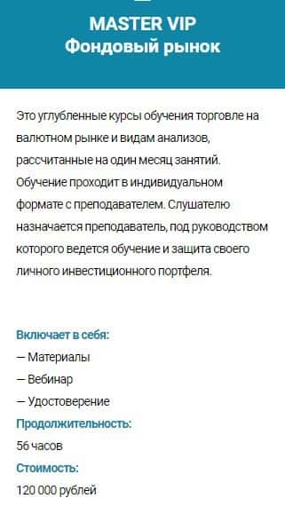 Курс обучения MASTER VIP Фондовый рынок - стоимость 120 000 руб. Сюда входит: материалы, вебинар и удостоверение. Продолжительность обучения - 56 часов.