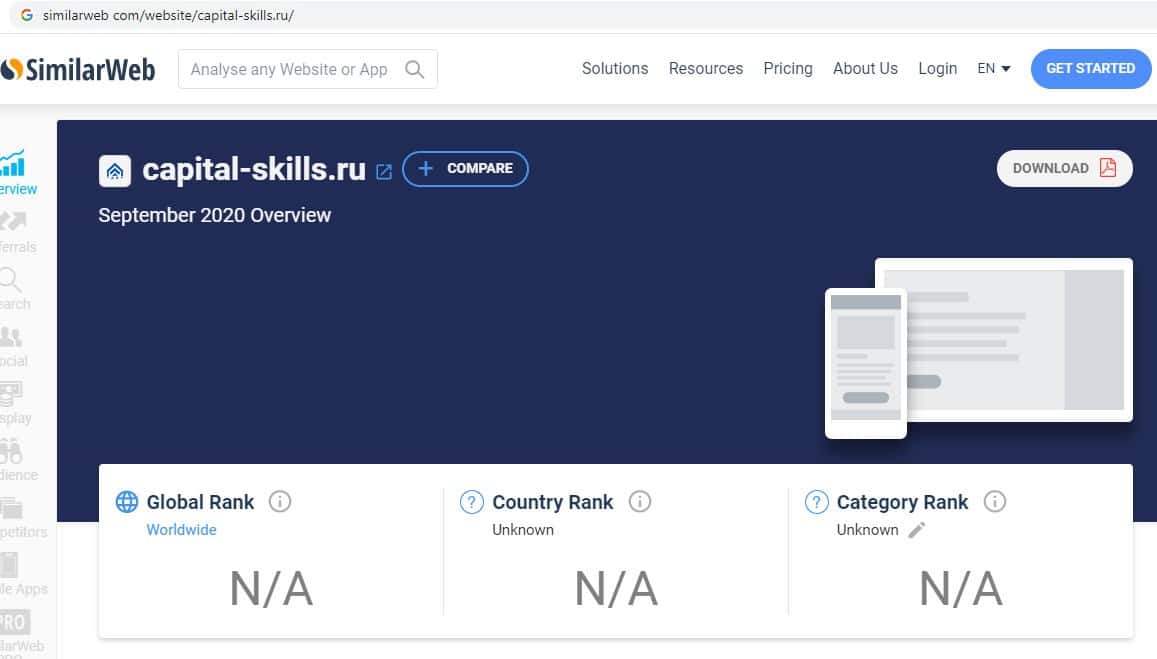 Лохотронская организация Капитал Скиллс не имеет своей аудитории в сети - это очевидно, так как онлайн-сервис просто не может индексировать источники трафика сайта лоховодов!