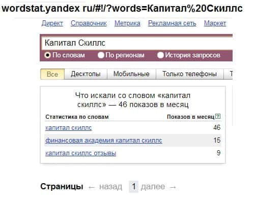 Второй запрос в поисковик Яндекса - название бренда лоховозки на русском языке с пробелом "Капитал Скиллс". Результат 46 показов в месяц - показатель низкосортной конторы!