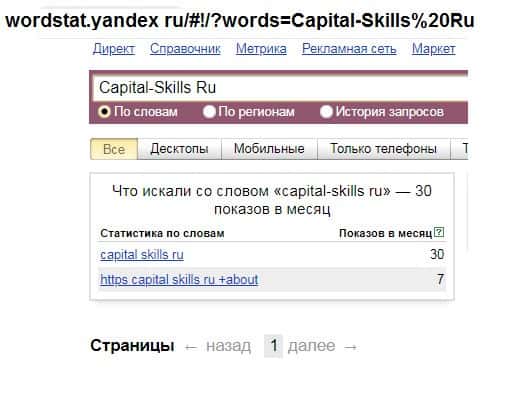 Еще один запрос по лоховозке в Яндекс - это название бренда на английском языке с пробелом "Capital-Skills Ru". Результат 30 показов - это говорит о непопулярности организации!