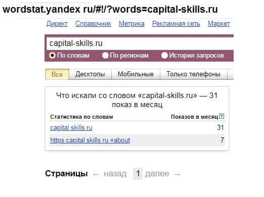 Для того чтобы понять насколько популярная контора Капитал Скиллс в сети, рассмотрим запросы в поисковике Яндекс. По названию домена шараги "capital-skills.ru" - 31 показ в месяц.