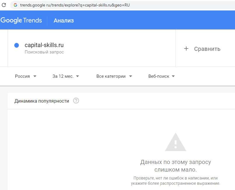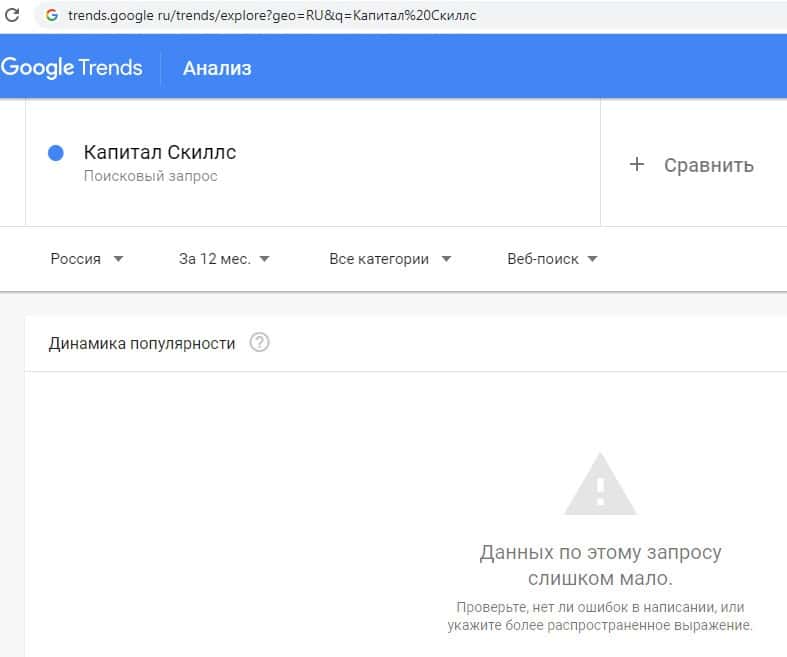Третий вариант, который мы проверим в поиске Google - это название бренда на английском языке "Capital-Skills Ru". Результат лоховозки неизменный - 0 показов в месяц.