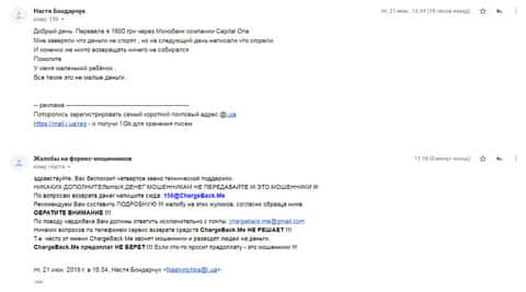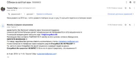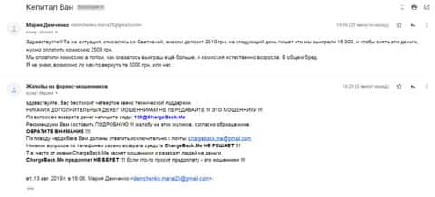 Девушка написала в интернет-компанию ChargeBack.Me так как не знает как вернуть утраченные деньги из брокерской конторы Капитал Ван. Вначале мошенники требовали малую сумму денег, потом всё дошло до 2500 гривен. Когда жертва начала выводить ей сообщили о выигрыше и потребовали оплатить комиссию, после чего жулики перестали выходить на связь.