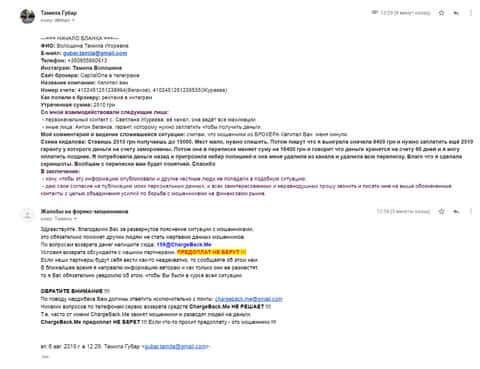 Данная афера была провернута очень быстро, так как мошенники конторы Капитал Ван постоянно подгоняли клиента вложить 100 долларов. В итоге все деньги заморозили и пострадавшей стороне пришлось написать жалобу в организацию ChargeBack.Me чтобы решить эту ситуацию.